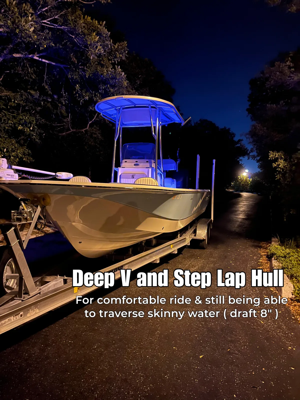 This fishing machine boasts skinny water 8" draft capability with the smooth ride and feel of a deep V hull and plenty of room to fish 6 anglers comfortably!